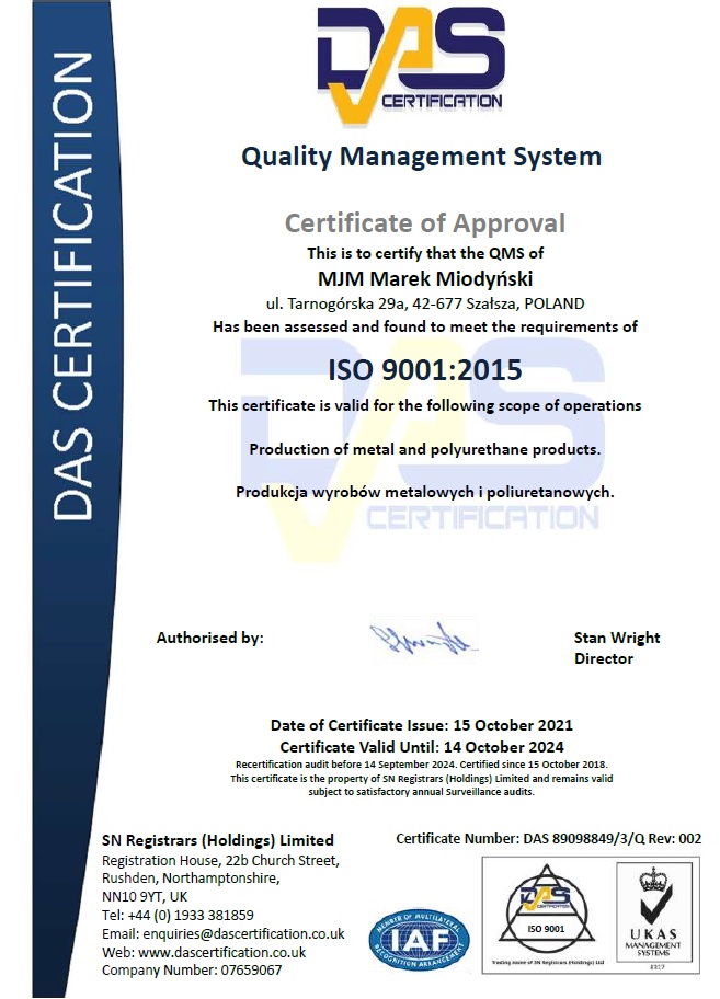 9th March 2010 MJM Marek Miodyński company received PN EN ISO 9001:2009 certificate, which confirms all the standards are fulfilled. Moreover, 15th October 2018 we implemented PN EN ISO 9001:2015 system and received a certificate.